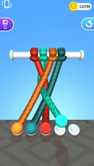 百变绳结3D游戏中会出现很多种颜色不同的绳子缠绕在一起,打成难看的绳结,玩家需要通过操作将绳结解锁开,现在你将要头脑风暴来找到正确的方式,你的目的就是让缠绕的绳子变成单根绳子,每一个关卡都不局限于一种解绳方法,思维越是缜密玩起来越是简单,玩家的操作不同,所有办法会有不一样,让闯关结果来验证你们的对错。
