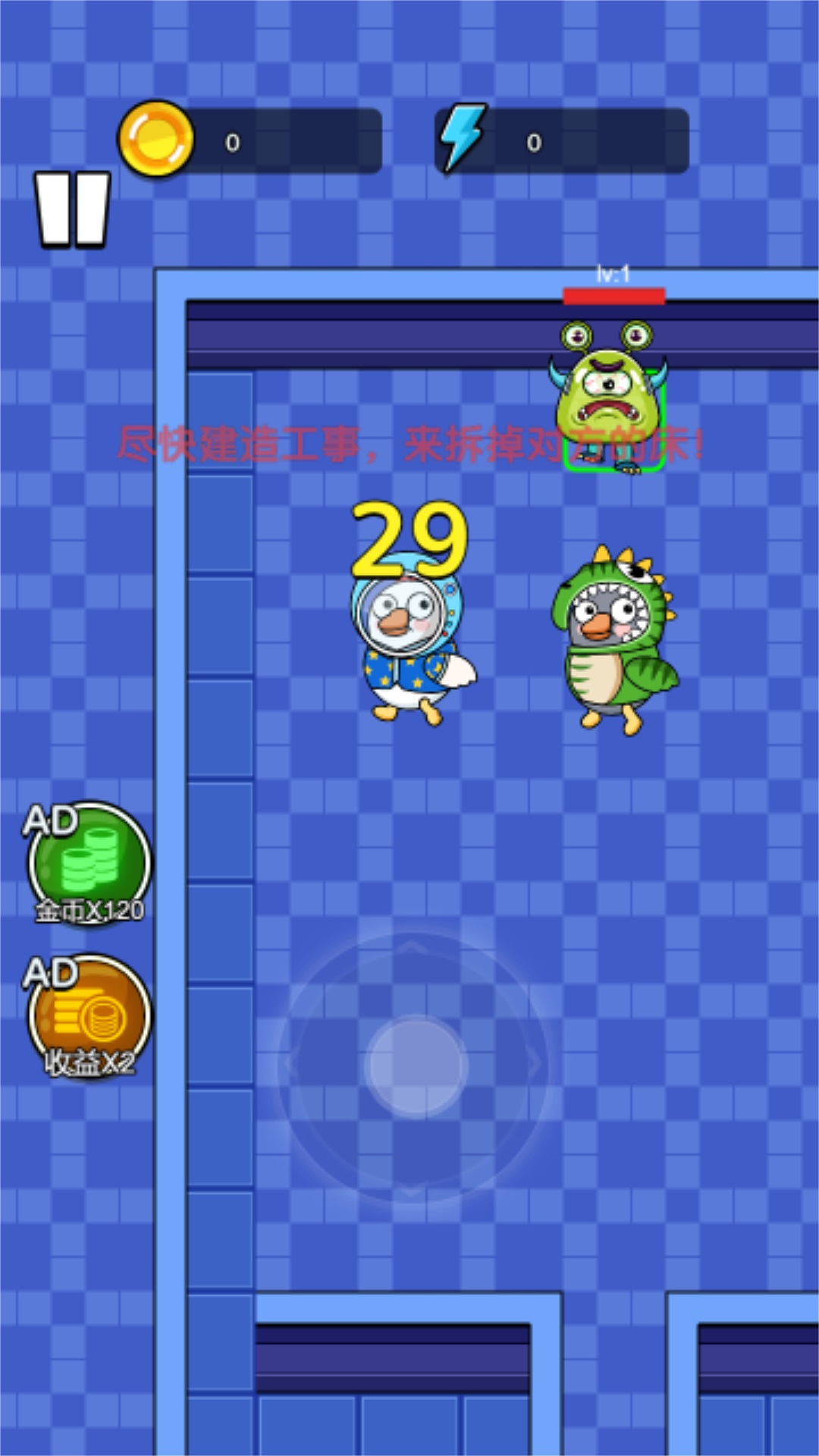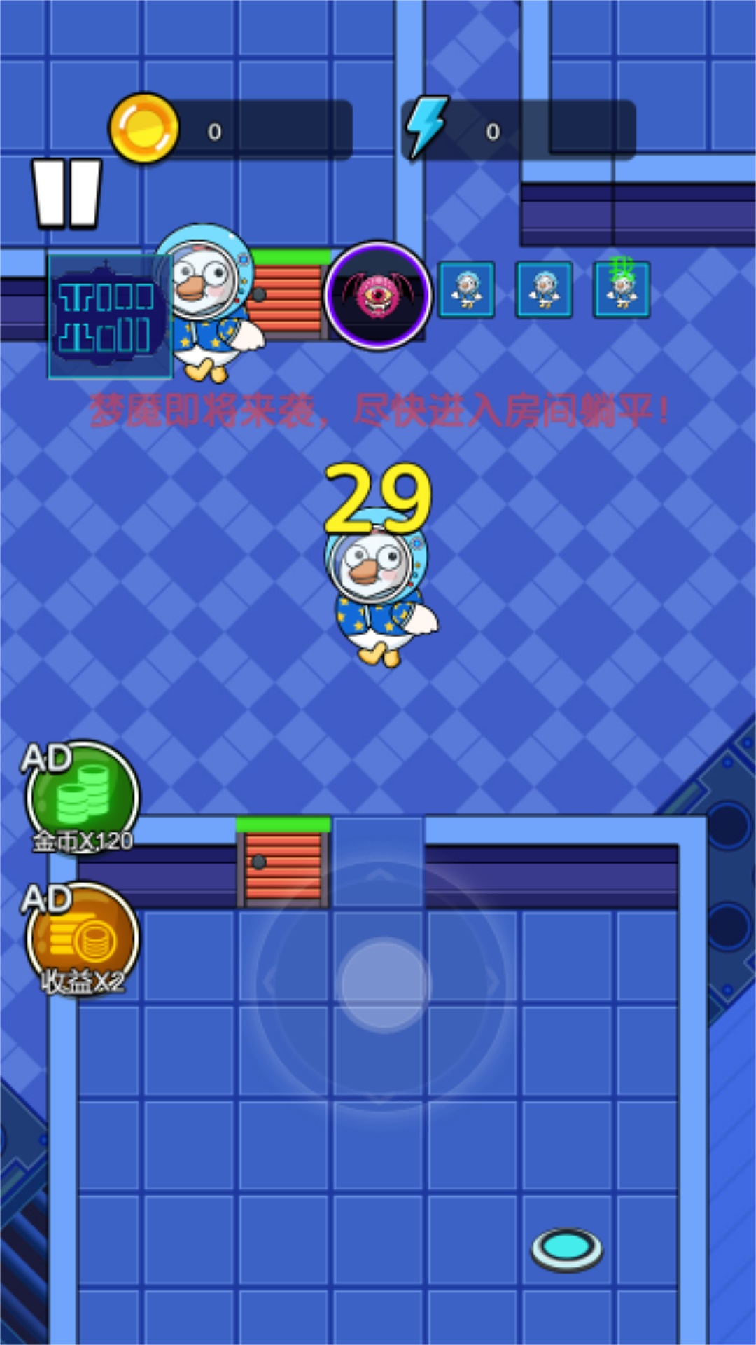 鸭鸭躺平记安卓版是一款休闲益智类的冒险游戏。游戏中玩家需要操控自己的鸭子在飞船里躲避敌人的追击,玩家需要通过不断地开采资源,升级建筑抵御敌人的攻击,让鸭子在飞船上生存下去。游戏中玩家不需要太多操作,只需要操控鸭子选定房间让然后躺平收集资源,等着升级建造防御设施,游戏操作简单,画面魔性搞笑,是一款非常不错的休闲娱乐游戏。感兴趣的小伙伴快快点击下载吧,让我们变成鸭鸭一起躺平。