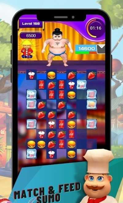 饥饿饲料是一款以消除玩法为主的休闲游戏,玩家在游戏里要通过消除的方式去帮助厨师获得各种食材,然后为相扑选手制作各种没事,让他们吃得饱饱的,然后打败对手。厨师为相扑选手做出各种精美的美食,给他们补充能量,帮助完成挑战。玩家需要进行一对一的PK挑战,完成对战任务可以获得更多游戏奖励哦。在有限的时间内完成游戏挑战,能够改变你的命运得到更多的能量道具。