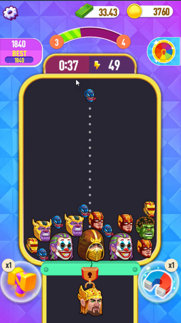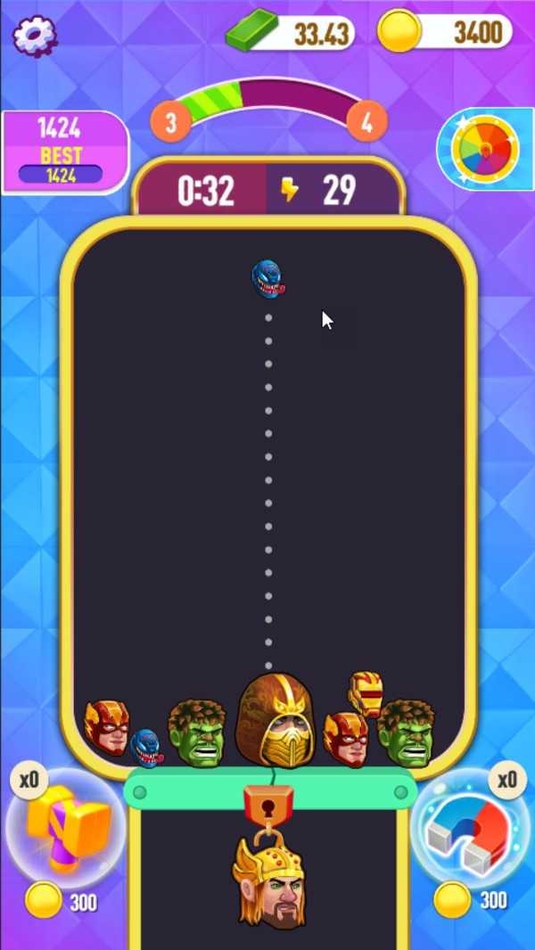 1、在游戏中玩家需要不断的合成。屏幕上方会掉落很多不同的超级英雄;