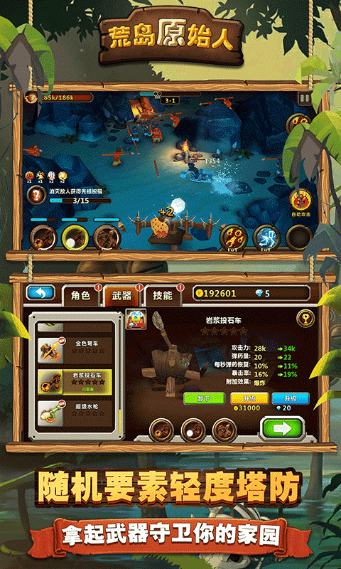 争夺海岛,对抗其他原始人部族,守卫你的族人。获得更强的武器,学习更强的技能,扫荡海岛成为最强原始人!原始人大冒险,开局一块石头,技能装备全靠打!提升自己的装备战力,成为原始部族皇室并赢取三星皇冠!
