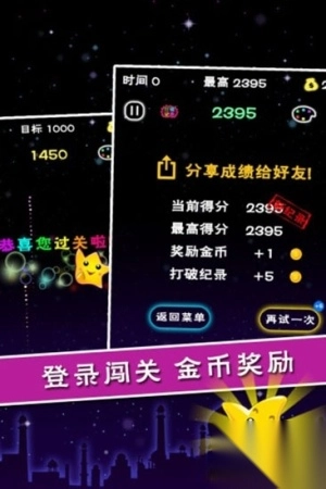 通过奖励和购买道具,你可以利用它们来消除更多的星星。游戏拥有许多关卡和挑战,总会让你有着不同的游玩体验。
