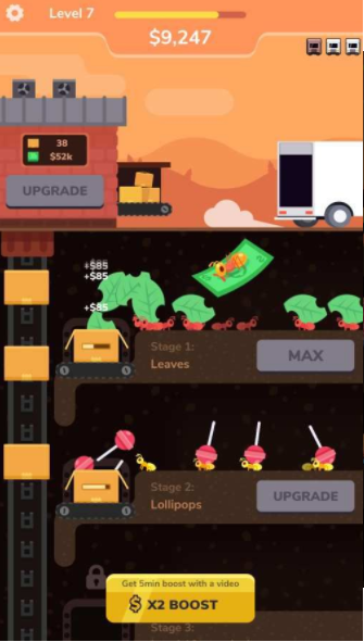 1.小清新的游戏风格,可爱的小蚂蚁不停的收集资源!发财。