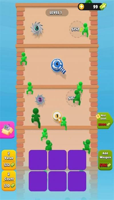 僵尸爬塔是一款十分简单的趣味僵尸塔防小游戏,玩家需要建立超高层级的防御塔,并且在塔身设置多种陷阱,放置僵尸的进攻,游戏将会以第三人称的视角自由进行,玩家可以通过消灭僵尸获得的金币设置全新的陷阱和武器,也能帮助自己的陷阱不断升级,应对数量繁多的僵尸,轻松简单的玩法操作,可以帮助玩家释放更多的压力。