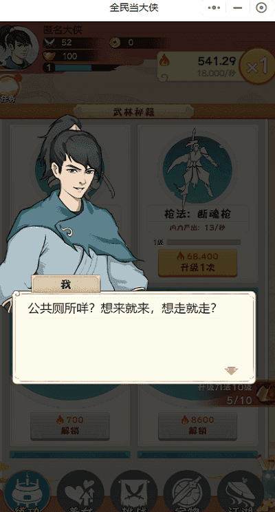 全民当大侠是一款十分有趣的角色扮演类型的游戏,玩家可以自由选择自己喜欢的职业来开始自己的冒险,在冒险的过程当中,玩家会碰到很多的战斗,需要积累大量的经验来提升自己的实力,游戏的玩法和操作方式都非常的简单,玩家能够从游戏当中感受到很多的乐趣。