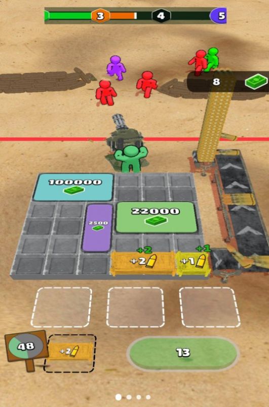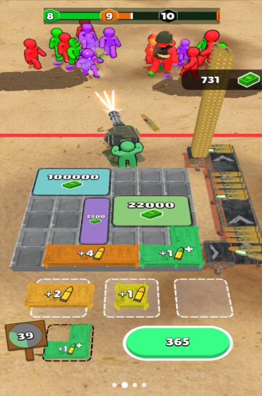 1、根据手枪里的子弹数字,向带有相同数字的敌人射击,促使敌人快速合并;