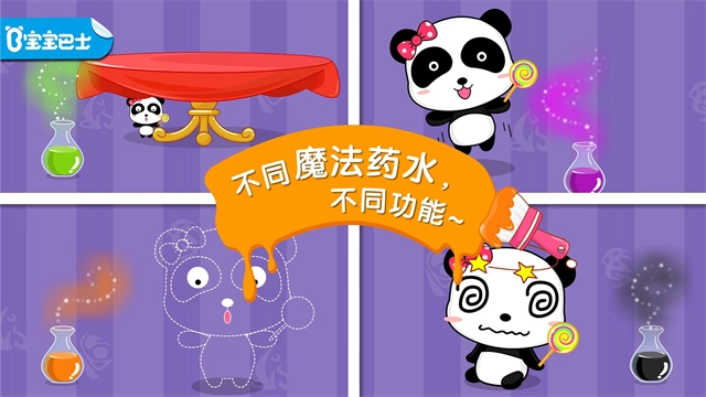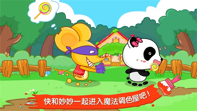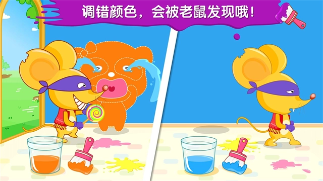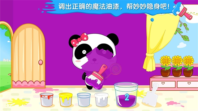 1、魔法油漆房间:通过将不同颜色的油漆混合在一起,调出正确的颜色,将其刷在熊猫妙妙的身上,妙妙就可以像变色龙一样隐身了。
