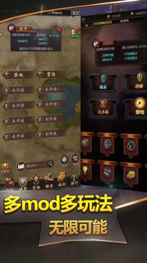 勇者无限进化是一款全新的单机暗黑奇幻世界RPG动作冒险类游戏,基本采用放置挂机的玩法模式为主,其中操作十分简单解压,并且还有超多免费的MOD模组,可以自由使用,更多通过文字模拟的方式,为玩家呈现出整个游戏世界的丰富内容,暗黑画风的背景特点,可以更全面的展现其中的奇幻冒险过程。