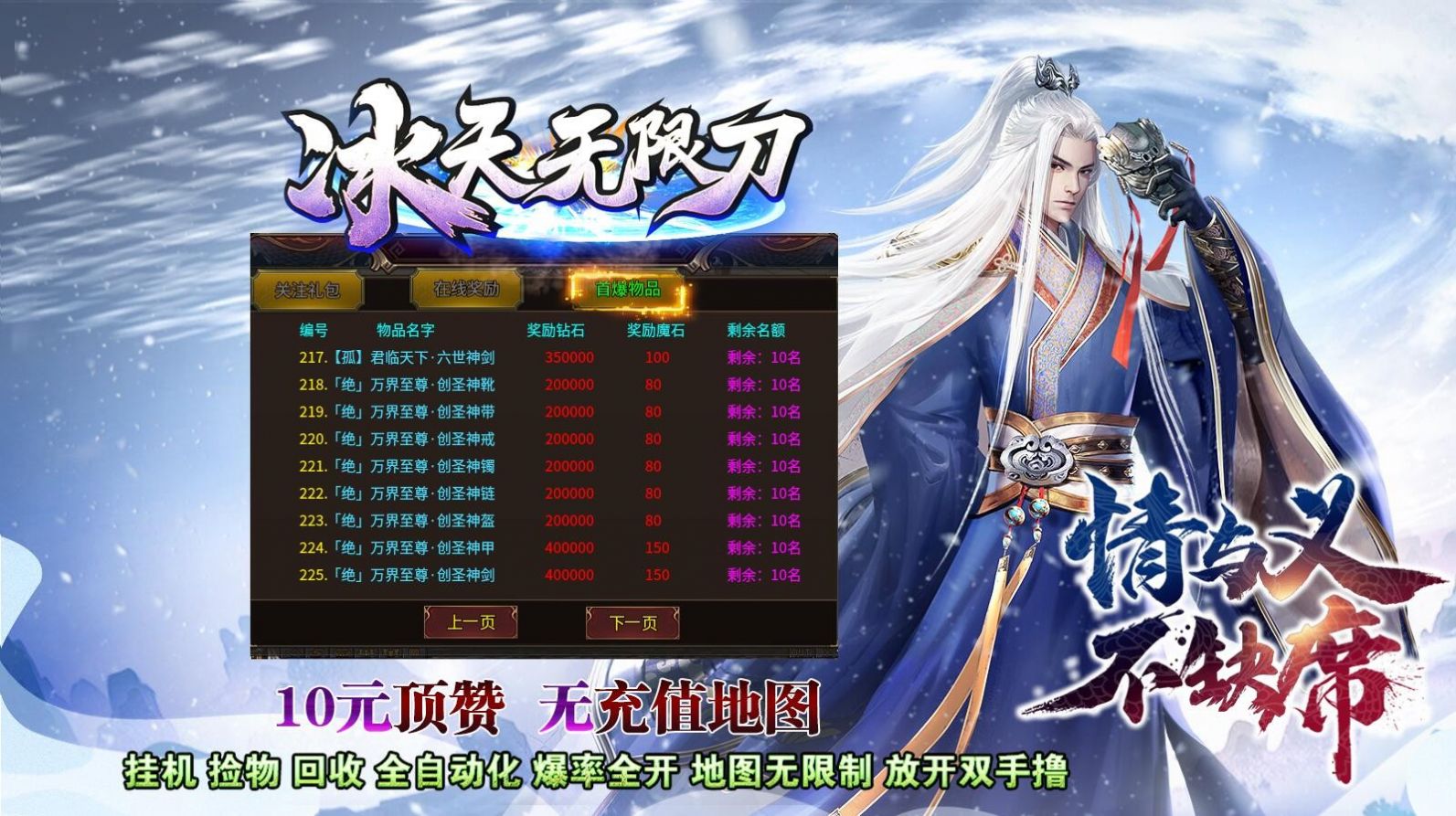 冰天无限刀是一款冰雪传奇世界的无限攻速传奇游戏,凭借超高攻速和顶尖爆率,展开玩家的精彩冒险挑战,让你感受更为丰富的游戏乐趣,和极为刺激带感的玛法大陆全新冒险之旅,开局送免充,更有开放世界等你挑战,所有装备武器全面自动回收,高度自由的爽快打金模式等你体验,全新时装系统为你带来惊艳画面反馈。