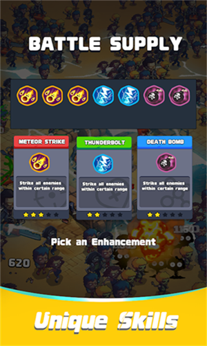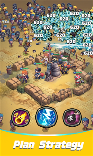 迷你闪电战放置策略塔防主题的一个疯狂肉鸽大战的游戏,玩家可以组建自己的作战小队,通过击败敌人不断升级,并解锁全新的强大技能,通过持续的肉鸽作战,玩家也需要帮助自己的塔防基地不断升级,持续强化安全范围以及攻击和防御力,放置自动战斗的玩法特点,搭配3D的疯狂即时战斗,可以带给玩家极为轻松的玩法体验。