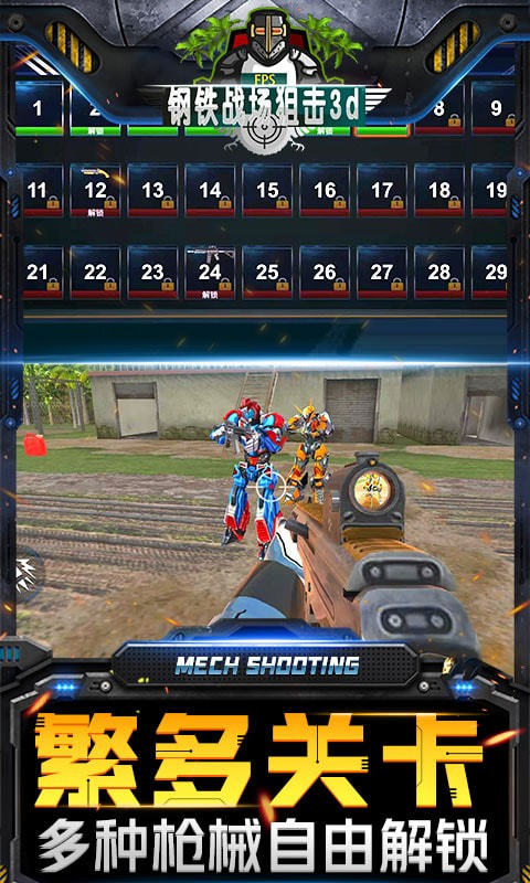 3、在机器人大战射击游戏领域挑战自我,在丛林,雪地和沙漠的不同环境中冒险。