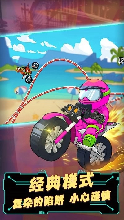 Q版卡通画风的一个趣味十足的摩托车主题游戏,可爱的画面,搭配2D平面的刺激操作,玩家都可以轻松上手。