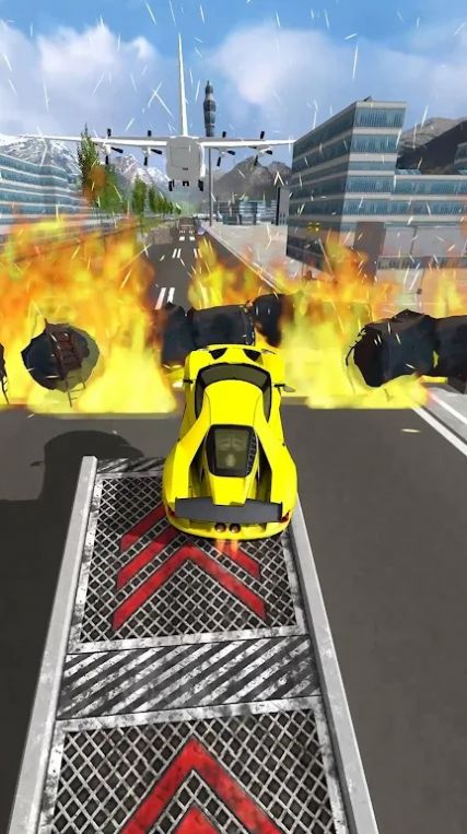 1、游戏通过控制车辆加速和跳跃,来穿过不同的障碍物,最终顺利地驶上降落的飞机上;