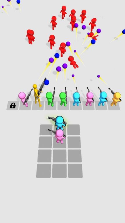 玩家需要通过合并具有不同属性的火柴人,并利用不同技能来对敌人进行排列射击。