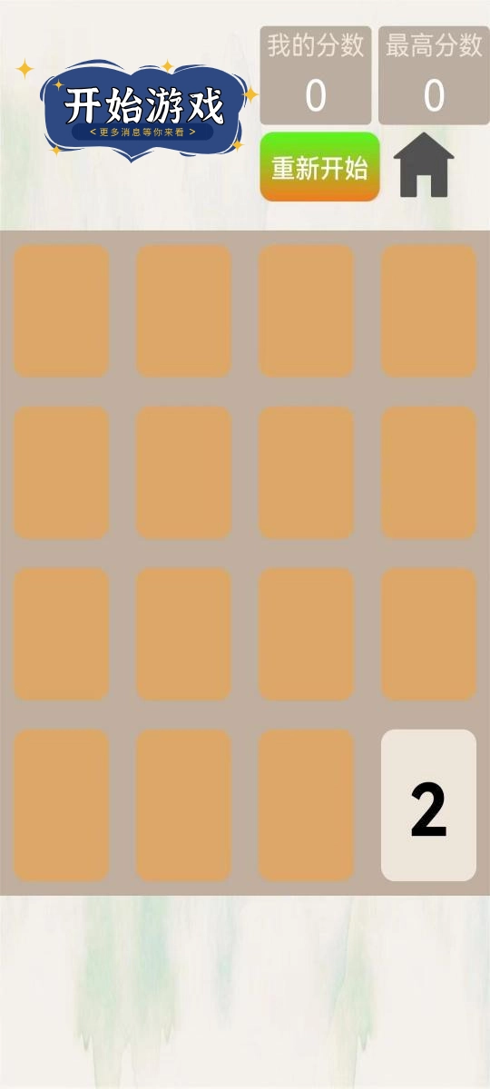 1、通过滑动屏幕控制数字方块的移动,使相同数字相遇并合并;