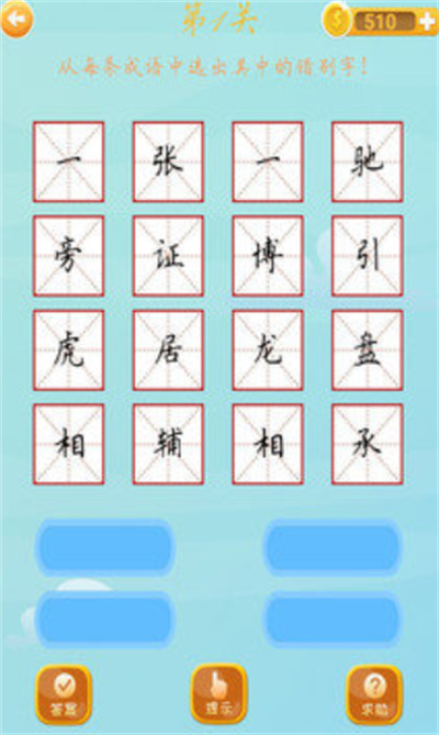 3、你将通过各种挑战,来增长了解丰富的成语使用知识,利用自己的闯关金币来兑换更多道具。