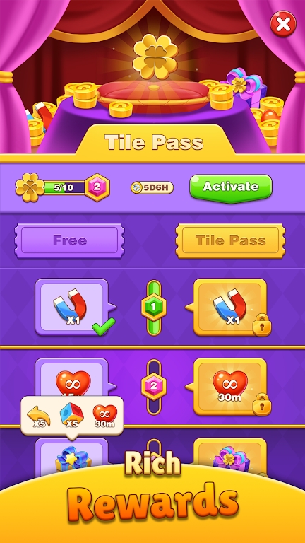 1、在三消关卡中匹配并消除相同的瓷砖,完成目标以获取装修所需的资源和道具;