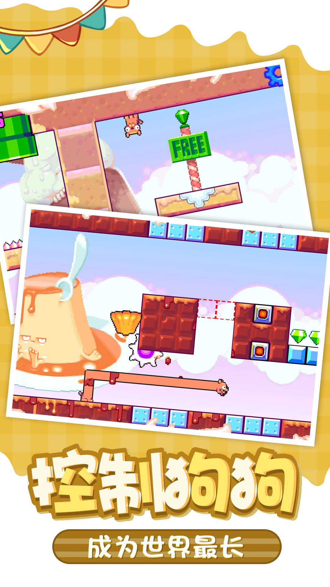 1、通过触屏控制小狗拉长身体,穿越各种障碍,收集金币;