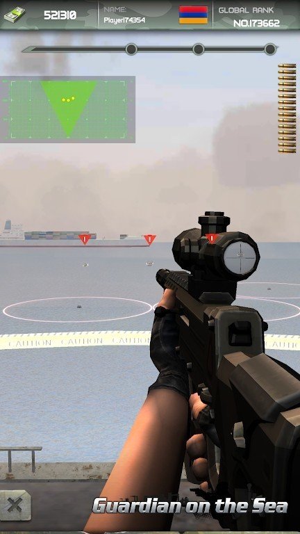 狙击各种海盗敌人,游戏非常考验玩家的枪法,注意游戏中你上方的绿色雷达。它可以告诉你你的对手在哪里。