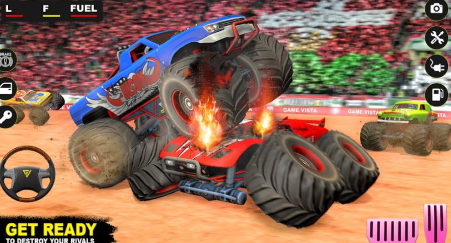 德比沙漠卡车(Monster Derby Truck Fighting)这款游戏主要是赛车竞速的类型,在对战模式中,玩家需要尽快通过关卡,并与其他玩家竞争最高得分,通过完成关卡和获得高分,玩家可以获得游戏内的奖励和金币,用于升级自己的怪物卡车或解锁新的场景和关卡。