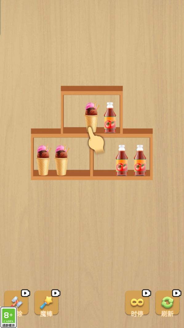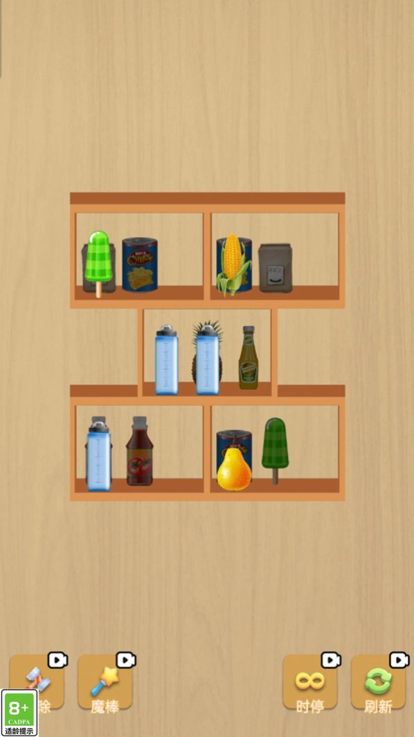 1、通过消除相同物品,清空全部的货柜,完成挑战;