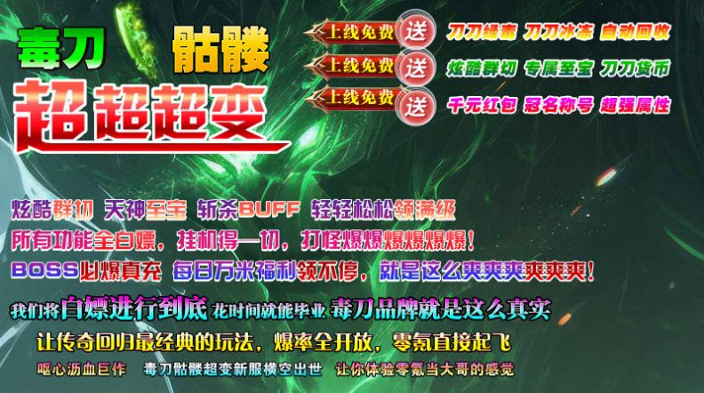 毒刀骷髅超超超变是一款顶尖爆率的超变传奇手游,以全新传奇世界的背景为主,解锁更为魔幻的玛法大陆热血打金搬砖挑战,多重福利资源,新手玩家上线即可免费赠送,超多新颖玩法模式都在等待玩家挑战,顶尖装备爆率,自动装备回收和交易,多重变态BUFF加成,带给玩家更多轻松解压的精彩挑战。