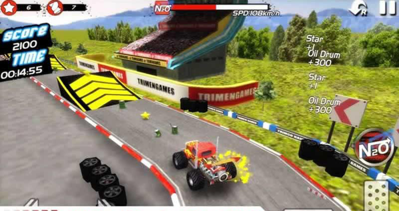 游戏玩法十分简单,整体操作高度自由,采用大脚卡车作为主角,结合卡丁车的玩法设定,展开其中的挑战。