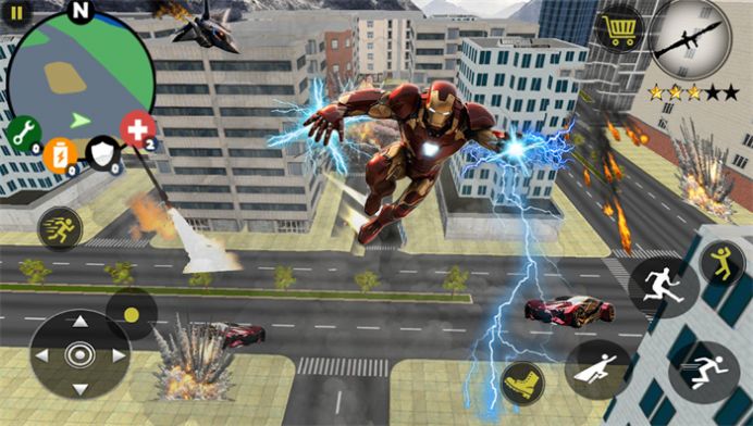1.结合蜘蛛侠和钢铁侠元素,打造独特的超级英雄角色,实现空中、地面二维战斗;