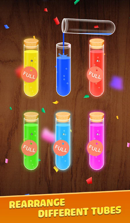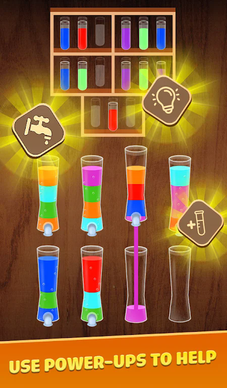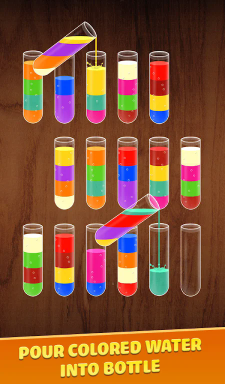 2、通过移动瓶子和导管,将不同颜色的水进行精准排序,锻炼玩家逻辑思维能力;