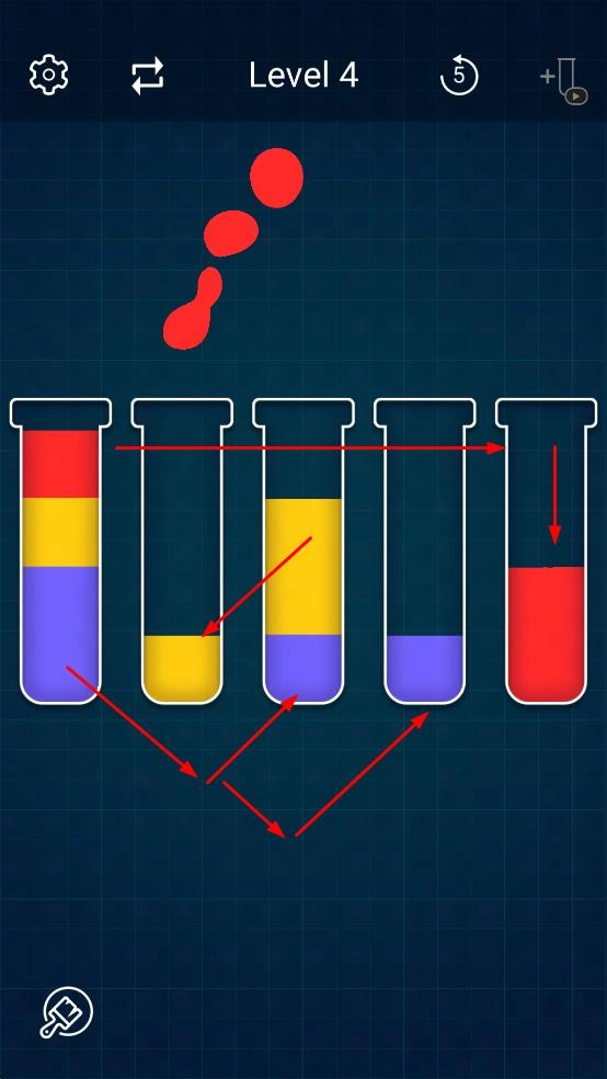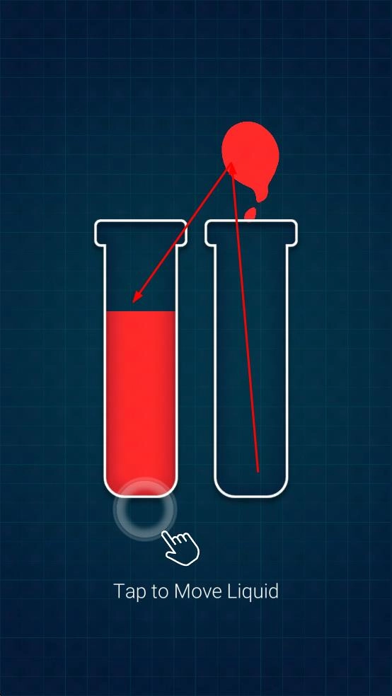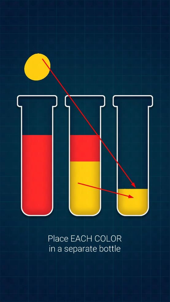 1、很简单的游戏操作,手指移动将各个粘液在不同的试管之间倒进倒出,考验智慧。