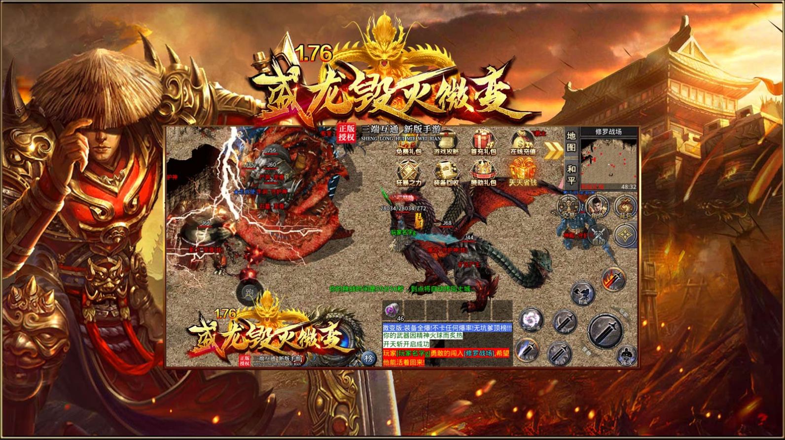 盛龙毁灭微变是一款正版官方授权的全新微变火龙传奇手游,通过端游的全新移植,让玩家体验创新的玩法模式以及规则设定,其中融入超多热门活动和免费福利,变态的属性加成,强大时装系统的战力增幅,让玩家可以在传奇世界中横行无忌,传统战法道三职业的选择,也能够让玩家迅速掌握这款传奇中的丰富玩法。