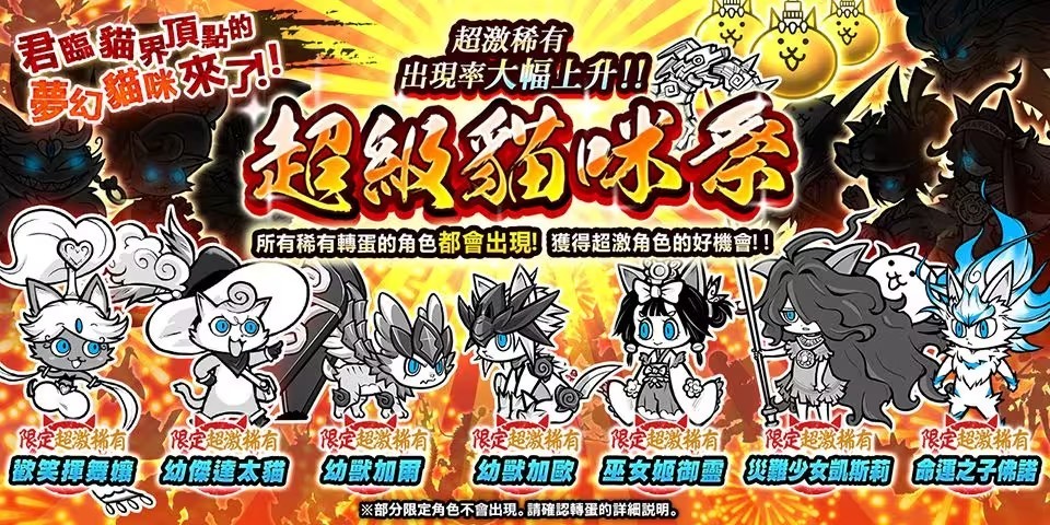 好康:好康转蛋(3/5/7)|福:附赠招福转蛋券|白金碎片:11连抽附赠白金碎片|限:限定角色(萌萌猫,黄金猫,猫咪城Mini,钢铁猫)|土龙鑽:土龙鑽部队(地底战队・地壳鑽,地底战队・木桩钉,地底战队・大力钳,地底战队・猫怪手,地底战队・电锯手)|援:猫咪军团支持队(洞悉先机猫,土豪弟,狙击手学徒)