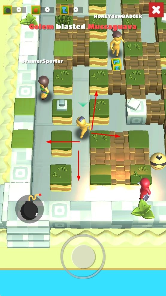 可以在迷宫的通道里放一枚炸弹,它会在其周围产生一个爆炸范围,你接触到的其他玩家或障碍物都会受到伤害。