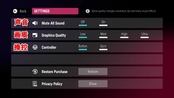 2、目前暂未提供中文设置,仅设有声音、画质、操作等选项。若手机性能良好,可将画质调至最高。