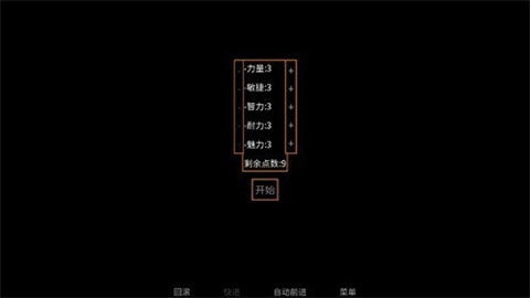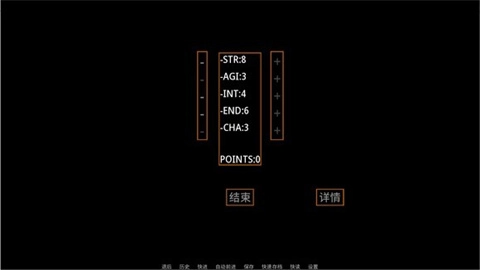 1、初始属性设定:力量(STR)数值为8,敏捷(AGI)数值为3,耐力(END)数值为6,智力(INT)数值为4,魅力(CHA)数值为3 。