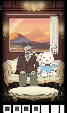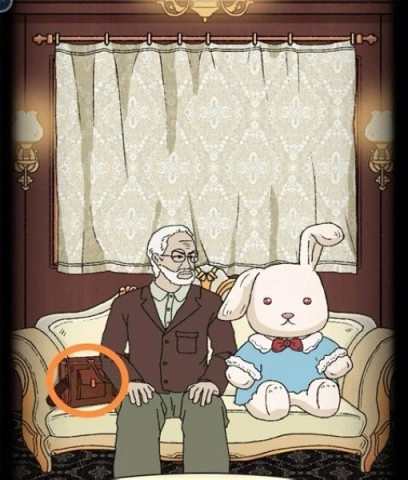 10、返回老先生那里,寻找兔子的眼睛。用木棒去够沙发右侧地毯上玩偶的眼睛,将其交给老先生。接着,在相关物品中放入追踪器,之后从老先生手中获取营养剂,再把营养剂拿给胖男人。