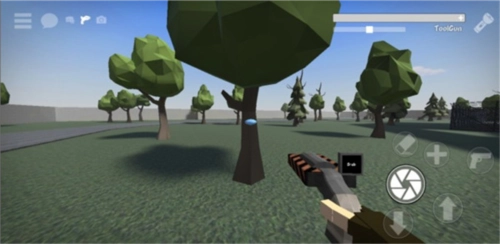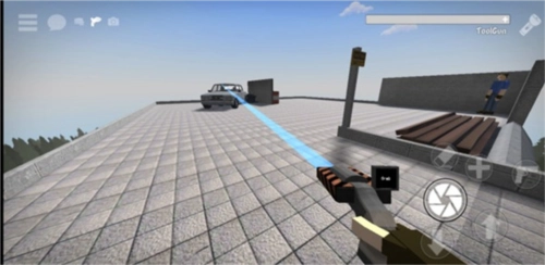 2、在操作过程中,向左移动同时可向右射击。若要切换武器,点击左上角即可。当使用手中的武器点击物体时,会出现蓝色的引线,把这些引线连接起来,之后就能通过滑动屏幕来改变物品的位置。
