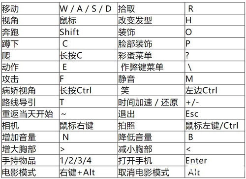 通过WASD可操控移动方向,利用鼠标来掌控视角。按住左Shift实现跑步。按下左Ctrl能做出笑的动作,按动次数越多,笑的频率越高,按动次数较多时甚至会出现迷之病娇狂笑。此外,按住左Ctrl还能开启病娇视觉。