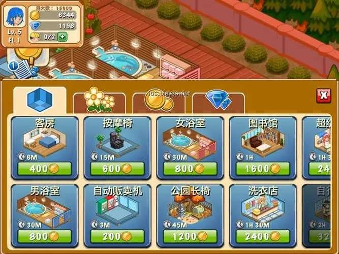 2、对设施进行升级。升级后,设施的使用费会有所增加。并且当设施达到5级时,部分设施能够进行合并,例如浴室和客房。