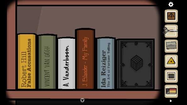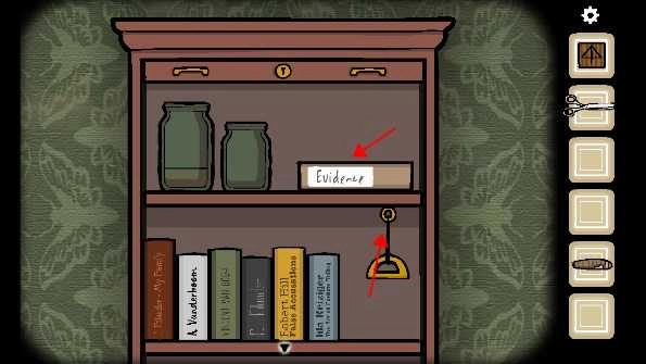 13、连续点击两次钥匙孔,随即出现眼睛。仔细观察眼睛上图案所处的位置,接着将时钟的指针转动到十二点四十五分。此时暗格打开,从中获取「三角形钥匙」。使用这把钥匙打开右边的抽屉,得到「胶片2」与「手帕」。再打开左边的抽屉,里面放着各类文件夹,文件夹中有关于书架上书摆放位置的提示,以及一个「文件」 。
