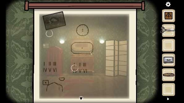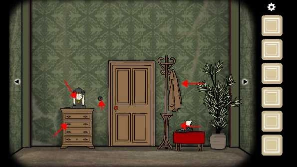 1. 从衣架上取下「大衣」,接着打开旁边的三层抽屉,从中拿走「剪刀」、「照片碎片」以及「铅笔」。随后,打开门旁的开关,走到右边,取走灯罩里的「照片碎片」。
