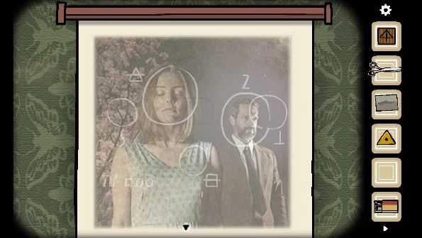 5、把五个碎片都放置在相框上,会得到提示“the woman”(中间有一个空格)。接着点击打字机输入英文,随后会出现一张纸。用铅笔对纸上呈现的男人、门、女人等图案进行涂抹,最后涂抹钥匙图案,就能获得“钥匙”。