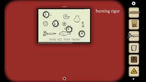 27、在打字机上敲入“burn”,随即会出现一张传单。接着,拿起剪刀把这张传单从中间剪开。剪完后,将剪开的两张纸重叠放置。此时,依据纸上所写的提示“燃尽一切可燃之物”,用雪茄去烧纸上能够被点燃的部分,直至烧出洞来,如此便可获得提示“life” 。