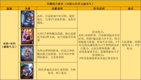 这套阵容不仅具备相当可观的输出能力,更关键的是其续航能力极为强大。其中有2名战士负责输出与控制,还有2名辅助角色,他们既能续航,又能兼顾控制与输出。尤其是在面对一些难度较高的副本时,这套阵容是优先之选。