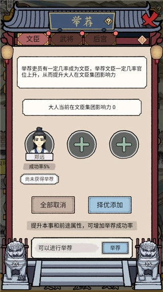 7、你也能够持续招募吏员、差役和义女并加以举荐,助力他们顺利成为文臣、武将或宫女,以此提高你的影响力。