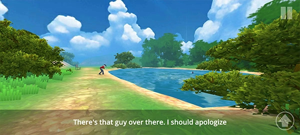 4、沿着路继续前行,来到湖边时看到了他,于是赶忙走上前去,打算向他道歉。