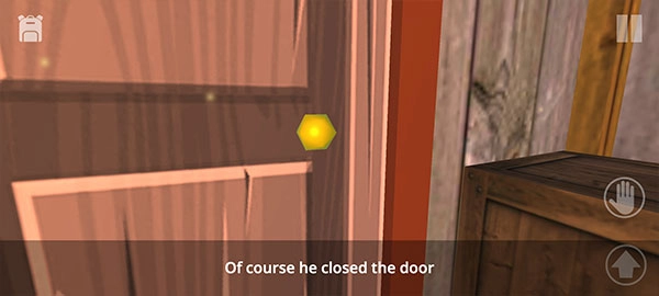 6、察觉到自己被关起来后,移步至门口并点击手掌图标,此时会触发相应动作,但门无法打开,得另外寻找出路。