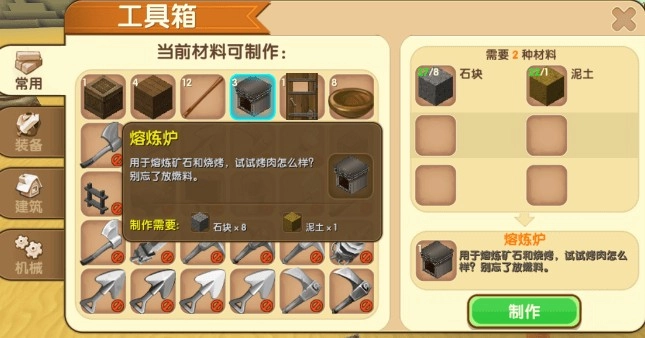 要是你的工具箱界面上不见熔炼炉图标,便意味着你的背包中缺少了相应材料。