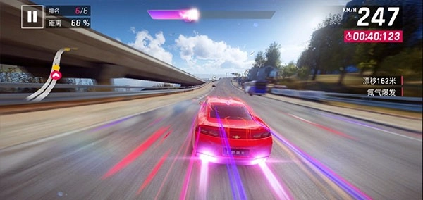 点击氮气按钮,将会激活氮气,车辆的速度将会在短时间内大量提升。氮气激活一共拥有四种状态,分别为单喷、双喷、完美氮气和氮气爆发,至于什么时候激活何种氮气,还需要玩家多多探索。