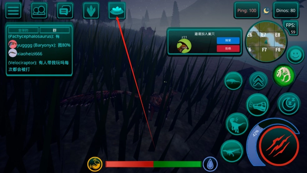 7、你可以建造巢穴,在里面养蛋,然后邀请服务器上的玩家到你的巢穴(家庭),但要做到这一点,你的恐龙必须完全长大并且你的帐户必须达到5级或更高。